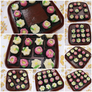 必要なお道具類も各テーブルごとにセットしておき、材料はルミアカップに1人分の練り切り生地、中餡、装飾生地をセットし、これを2種類分用意しておきました。