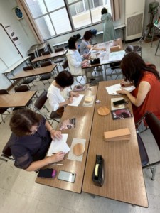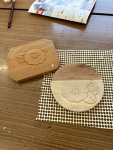 それぞれ図案を選び、彫刻刀の持ち方削り方を教わり、真剣な表情で和菓子銘々皿を彫り、一応彫り終えた時のみんなの笑顔は最高!